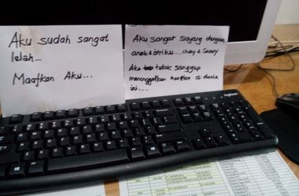 "Aku sudah sangat lelah. Maafkan Aku. Aku sangat sayang dengan anak dan istriku. Aku tidak sanggup meninggalkan mereka di dunia ini," begitu isi surat wasiat yang diletakkan di sela monitor komputer milik korban.